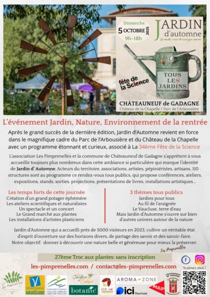 Christophe Casacoli nous présente la manifestation Jardins d’automne qui propose un programme très riche et très enrichissant au château de la Chapelle à Chateauneuf de Gadagne (84) le 5 octobre 2025. Le RDV propose des expositions, la création d’un potager éphémère, un grand marché et un troc aux plantes… Cette année la manifestation s’associe à la fête de la science…