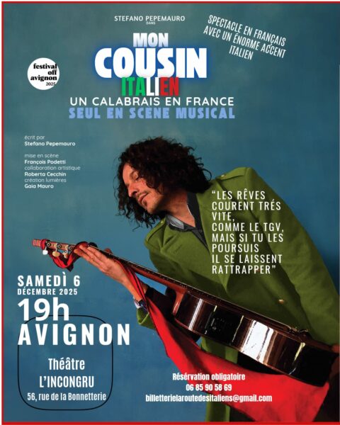Stefano Mauro nous présente la pièce Mon cousin italien, un Calabrais en France, qu’il jouera samedi 6 décembre 2025 au théâtre l’Incongru à Avignon. Il animera également un atelier Comedia dell’arte à l’Incongru dimanche 7 décembre, ouvert à tous.